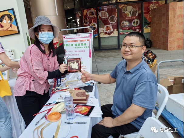 本次活动共设置不同类型的摊位,有许多表演与游戏活动,居民都积极参与。其中智盛社工负责的麦秆画、编绳与插花摊位更是受居民的欢迎,展示出智盛社工在“民生微实事”项目的实力。其中由麦秆画的非遗传人袁老师带领与指导居民,裁剪制作麦秆画。麦秆画是我国非物质文化遗产,在现场获得许多居民的喜爱,居民通过自己动手制作,完成了自己的作品,获得成就感。居民们也积极参与了编绳,智盛钟阿姨的指导下居民们纷纷编出满意的作品。插花活动也进行的如火如荼,通过剪,贴,粘,用花粘出一幅幅画。在活动收尾时依旧有居民想体验麦秆画,可见麦秆画之受欢迎程度。